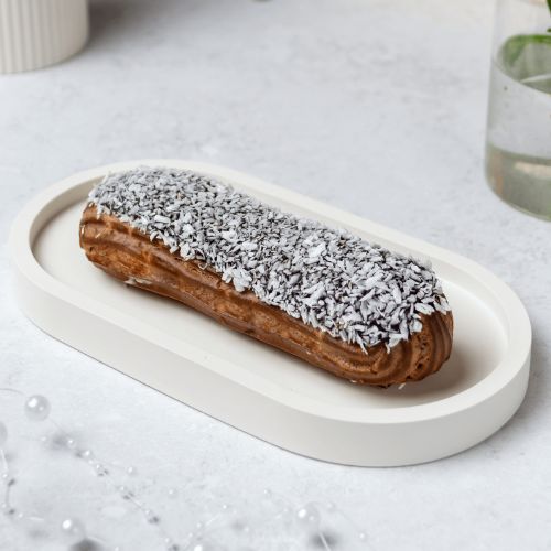 В основе этого десерта лежит легкое и воздушное заварное шоколадное тесто, которое скрывает внутри себя нежный сливочный ганаш. Верхушка эклера покрыта тонким слоем кокосовой стружки